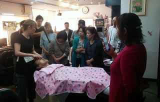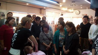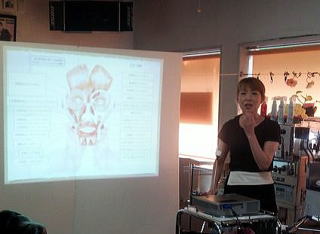 上尾支部では10月18日(火)午前10時より、ヘアーサロン アップル宅で、、「お顔ほぐし」の講習会を、お顔ほぐしインストラクターの 加藤すみ子 先生を招き開催しました。 いつもより女性の受講者の多い中始まり、最初はプロジェクターを使いながら、ケアとメンテナンスの違いや、顔や首の筋肉についての説明の後、施術手順を解説があり、続いてモデルを使っての施術に移りました。 施術後ののモデルは見事に顔がリフトアップし目も大きく見えました。 また、お顔繋がりで、眉毛の似合わせや、男性や女性のシェービングについて、営業に役立つアドバイスがあり終了しました。 |