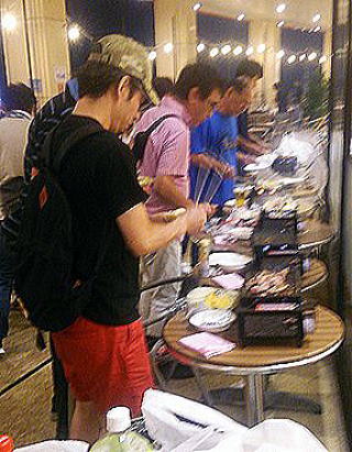 | 上尾支部は8月27日(月)に、昨年に続きアリオ上尾2Fフードコートテラスで、バーベキューを開催しました。 突然の豪雨に襲われスタートが遅れましたが、バーベキュー上級者たちの見事な連係プレイにより、次々焼きあがるお肉や焼きそばなどが各テーブルに運ばれました。 夏休み中ということもあり、家族連れの参加者が多く参加したバーベキューになりました。 |